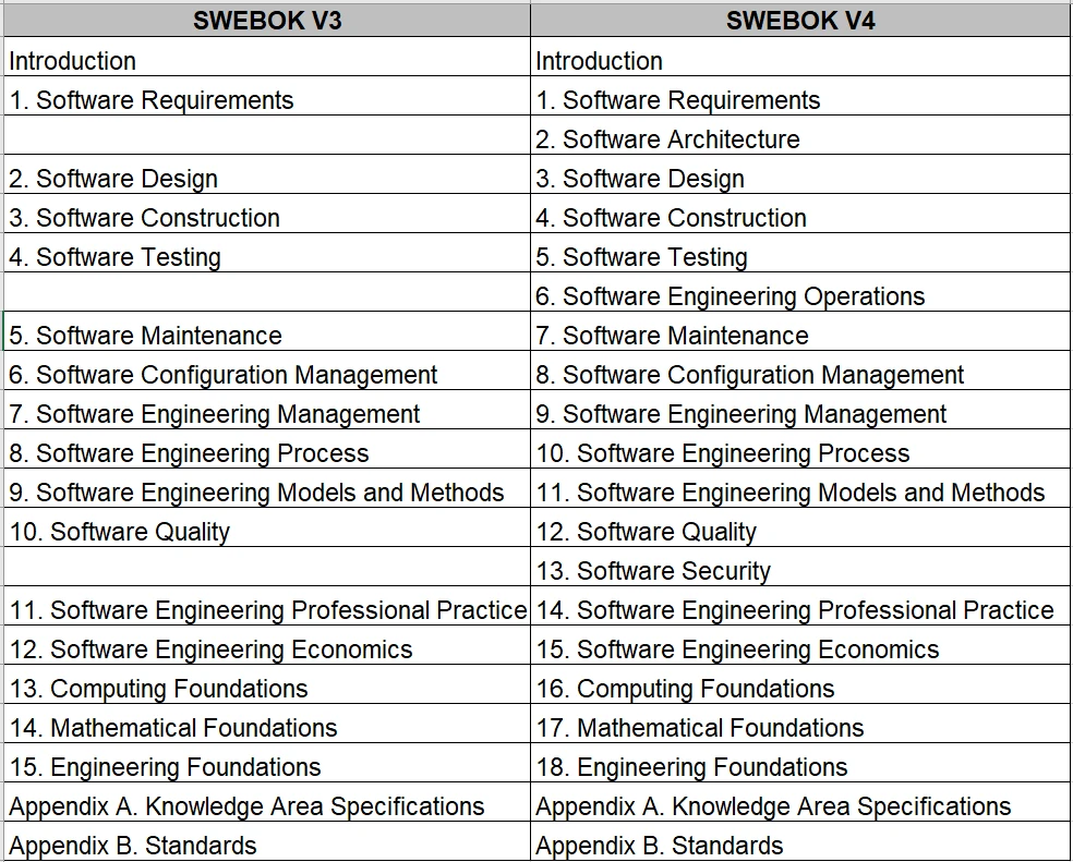 SWEBOK(Software Engineering Body of Knowledge)는 소프트웨어 공학의 지식을 정리한 것으로 소프트웨어 공학의 학문적인 내용을 정리한 것이다. 전통적으로 소프트웨어 공학의 모든 지식 영역을 정리한 것으로 V3에서는 15개의 지식 영역으로 구성되어 있다.