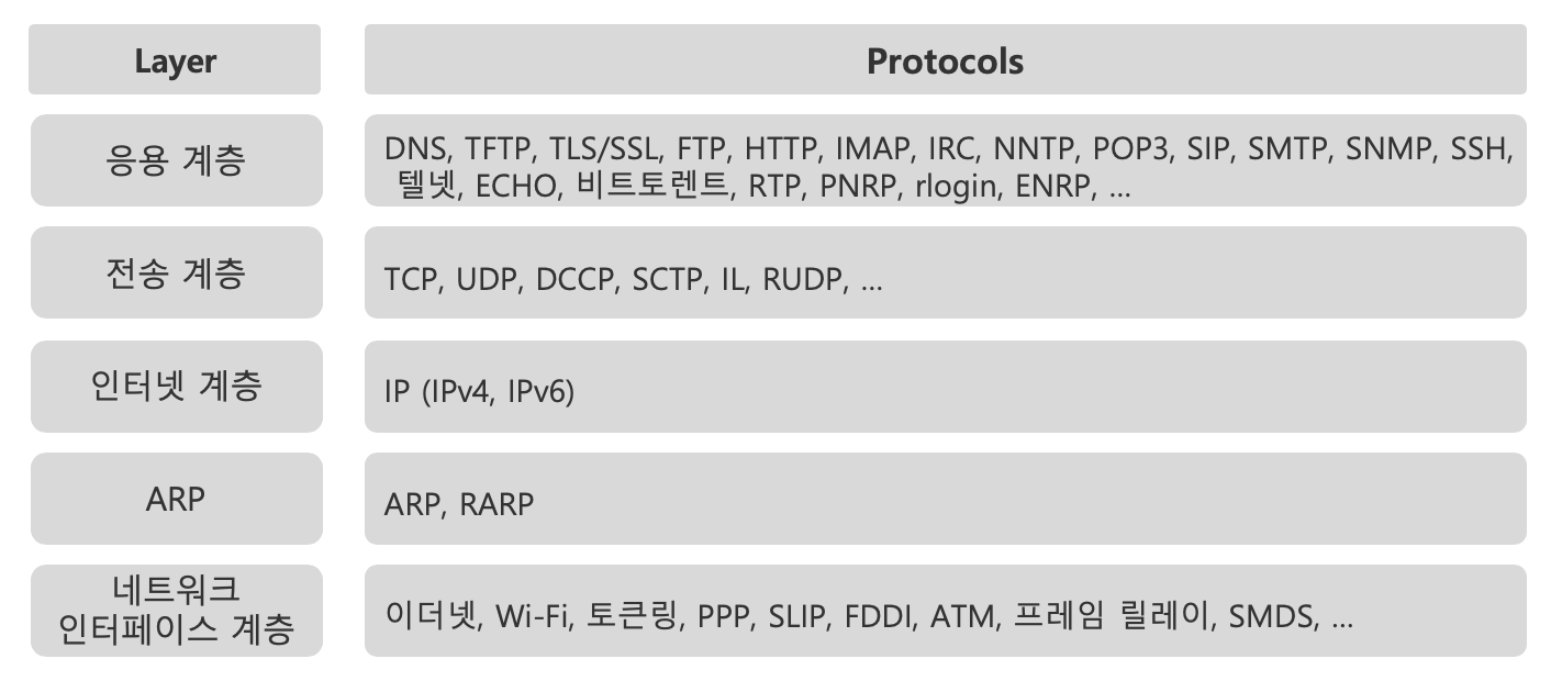 - 네트워크 인터페이스 계층: 물리계층으로 LAN, wifi 등 하드웨어적으로 네트워크 연결 담당.