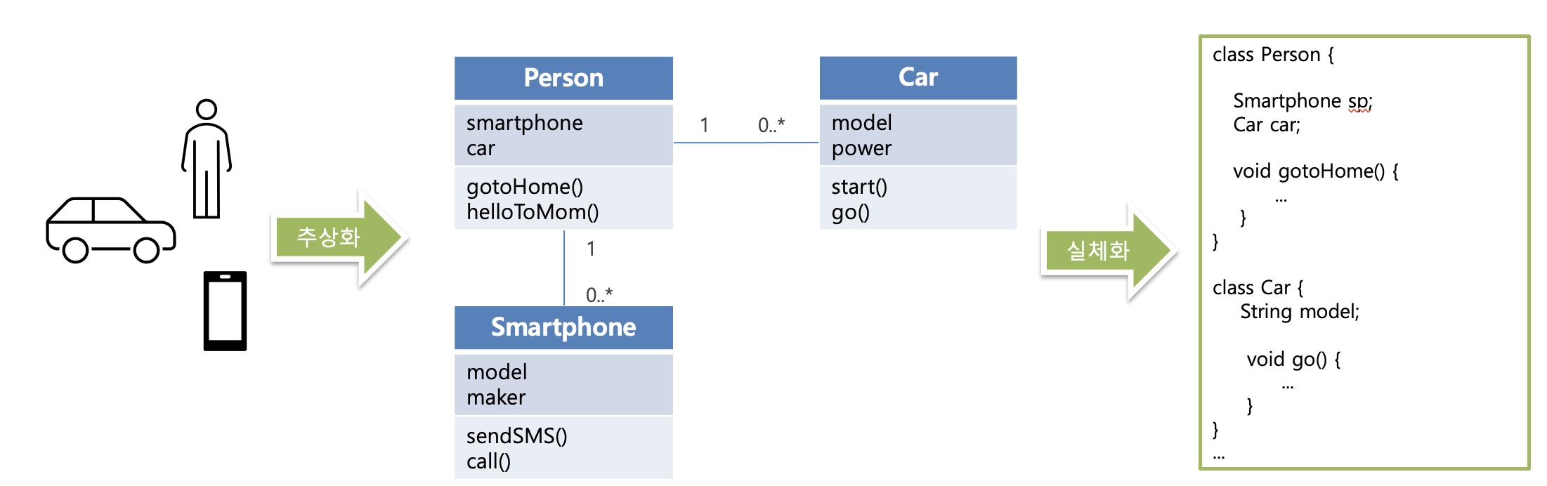 - 현실 세계로 부터 객체를 추출하고 추상화하려 클래스를 정의하고 관계를 기술해 나가는 것이 객체 모델링