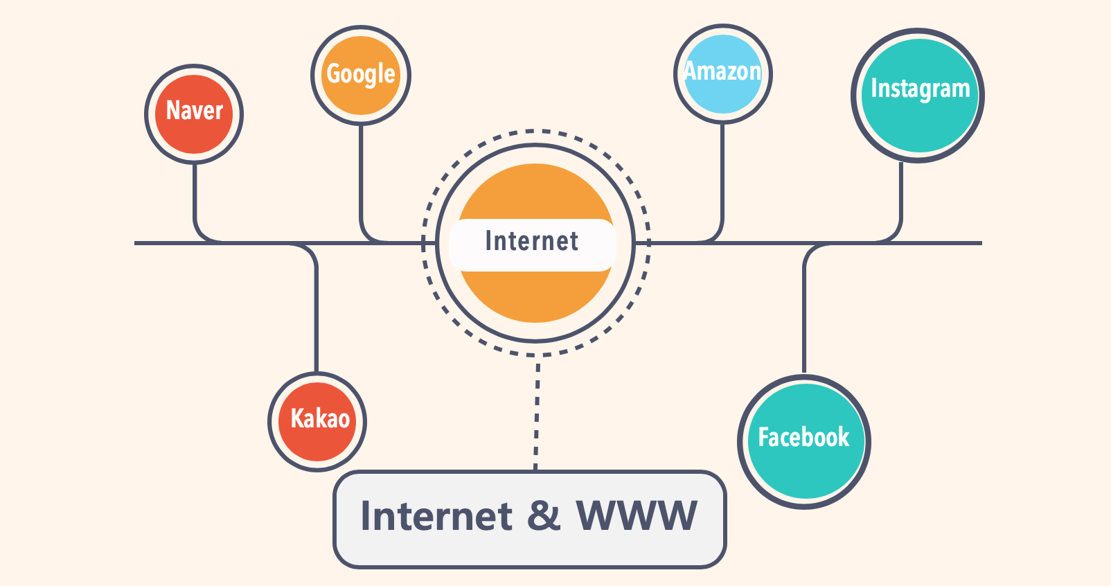 이러한 인터넷 이라는 네트워크 인프라를 이용한 다양한 서비스들이 존재하는데 예를 들어 네이버, 구글과 같은 월드와이드웹(www) 서비스가 대표적이다.