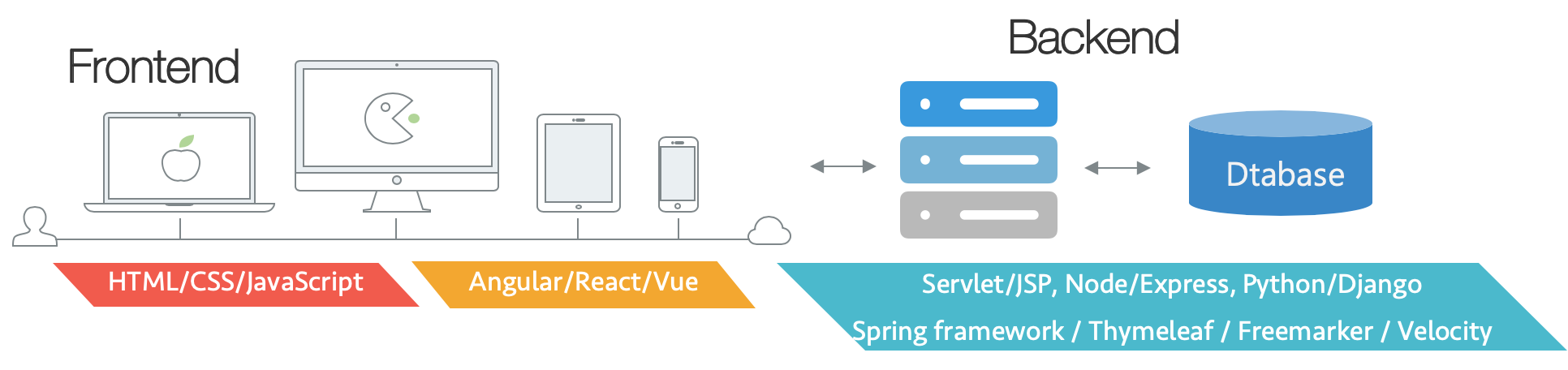 웹 개발은 크게 프론트엔드(Frontend)와 백엔드(Backend)로 나눌 수 있다. 프론트엔드는 사용자가 보는 화면을 구성하고 사용자와 상호작용을 하는 부분이며 백엔드는 서버와 데이터베이스와 같은 서버측 기술을 담당하는 영역이다.