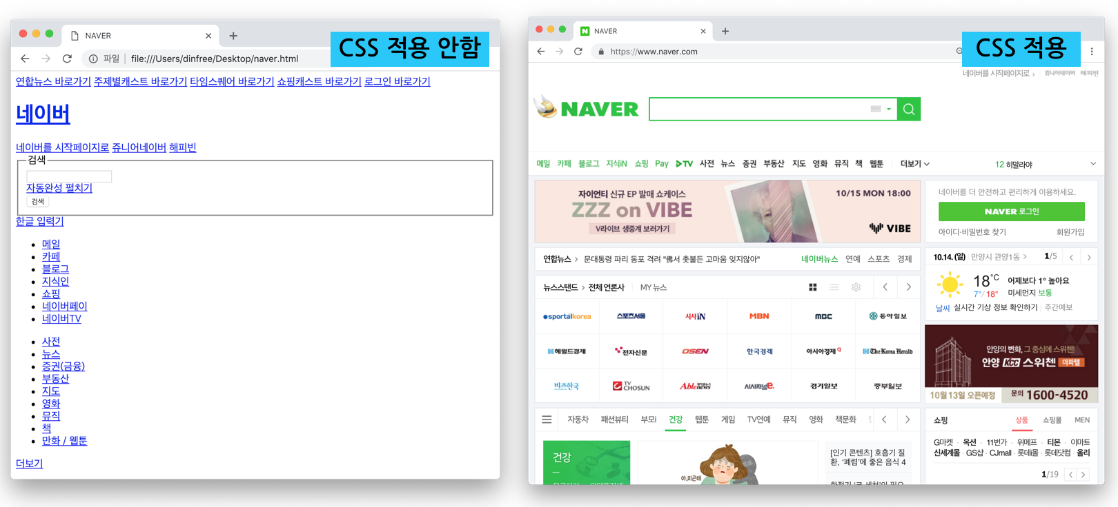 다음은 HTML로만 구성된 결과와 CSS를 적용한 결과를 비교한 것이다.