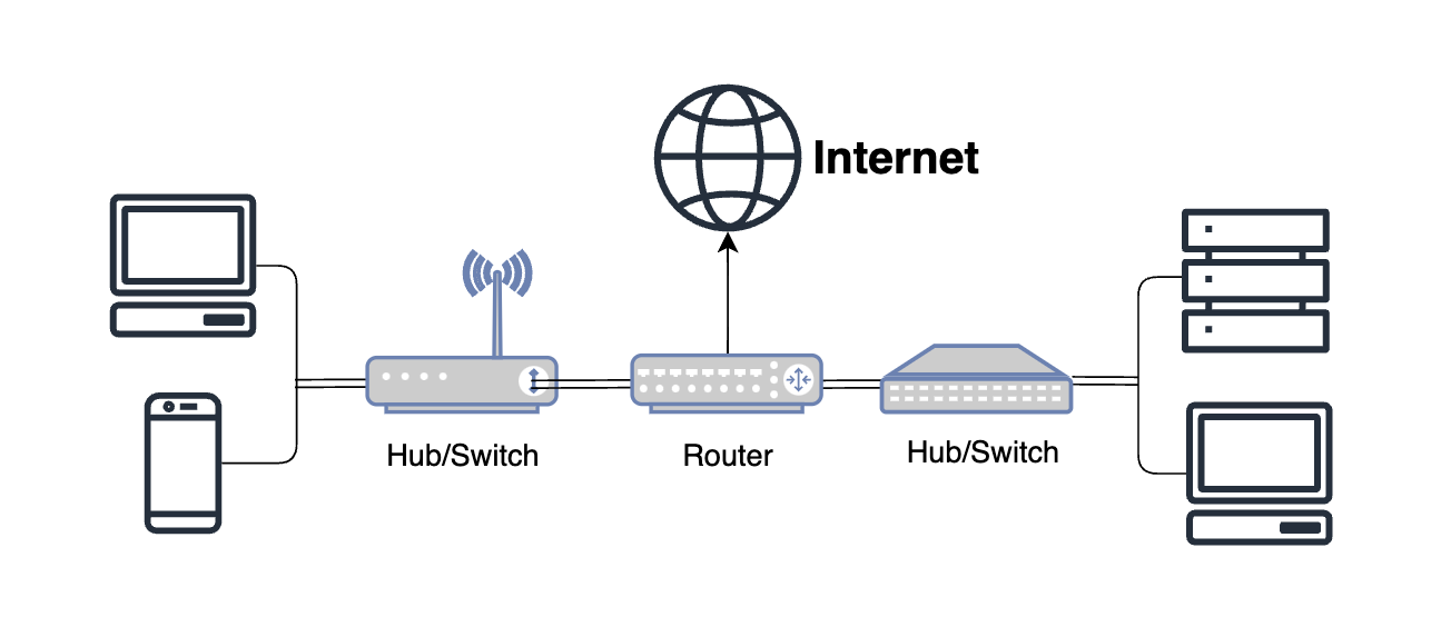랜 구성을 위해서는 허브, 스위치 등의 장비가 필요하며 원거리 네트워크 연결을 위해서는 라우터 장비가 추가적으로 필요하다